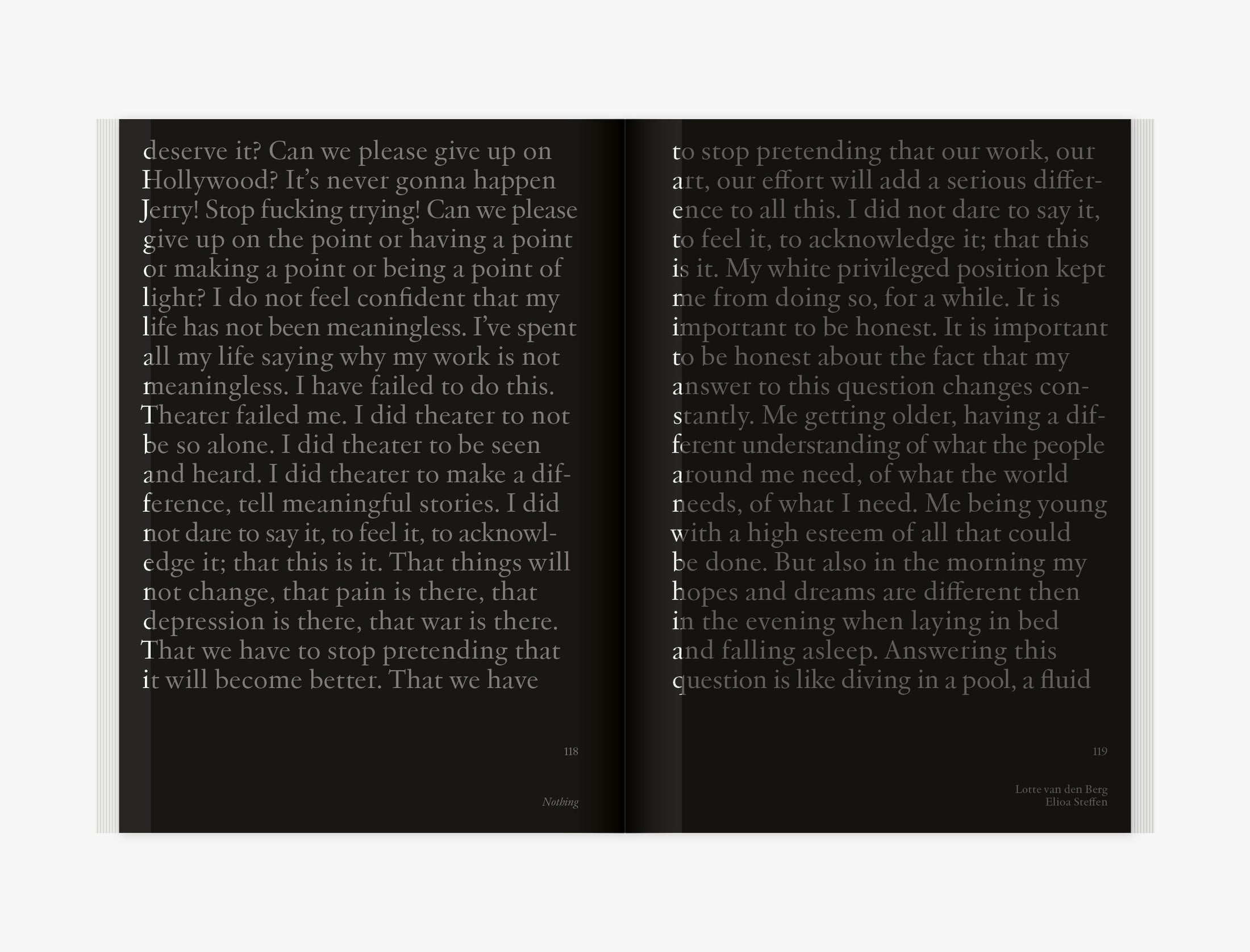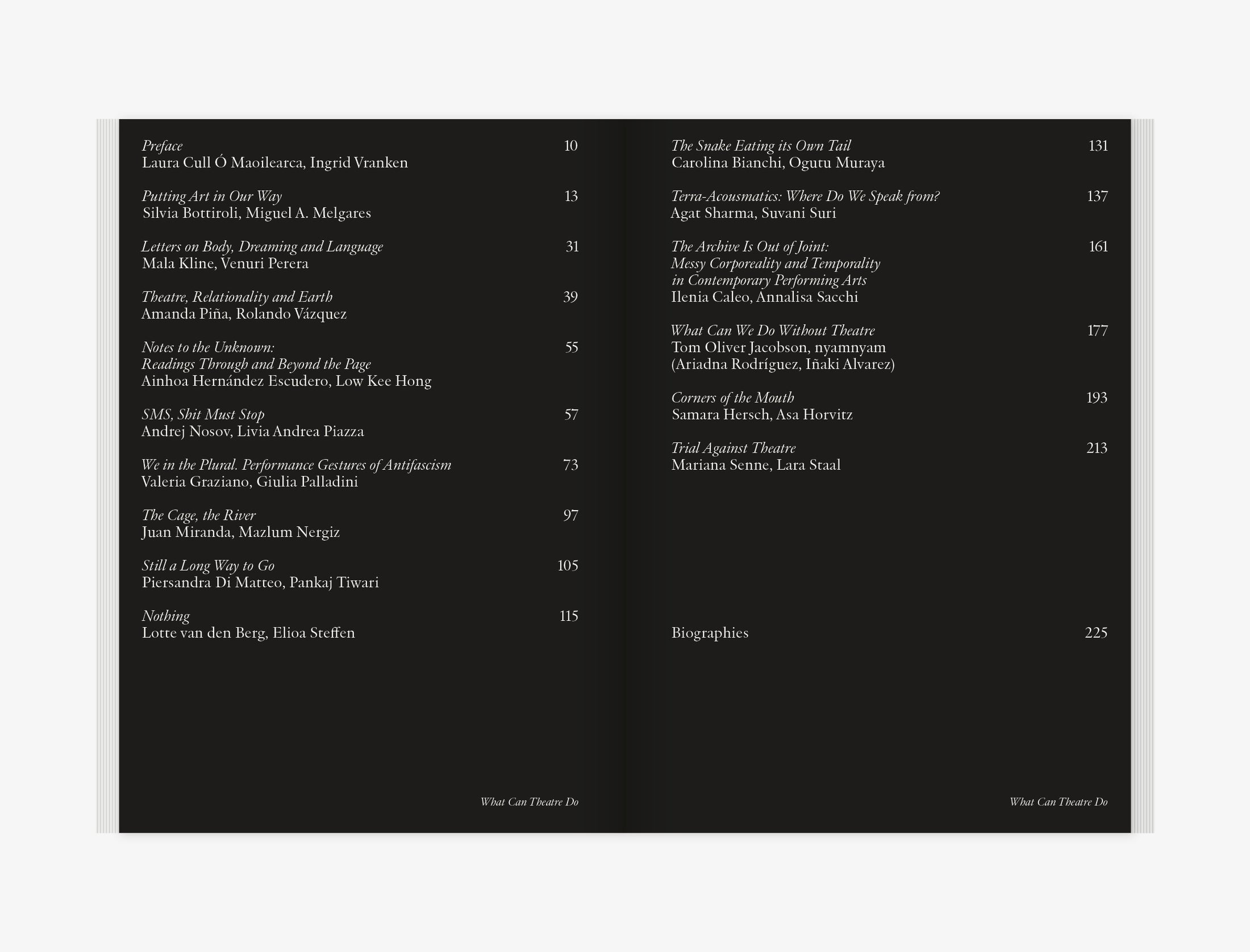 What Can Theatre Do tries to explore the idea of a book as a complex performative apparatus that can generate a space within which art and theory, and therefore also strategies of reality-making and of fiction-making, can entangle and affect one another, creating possibilities for the emergence of the not yet imagined.
