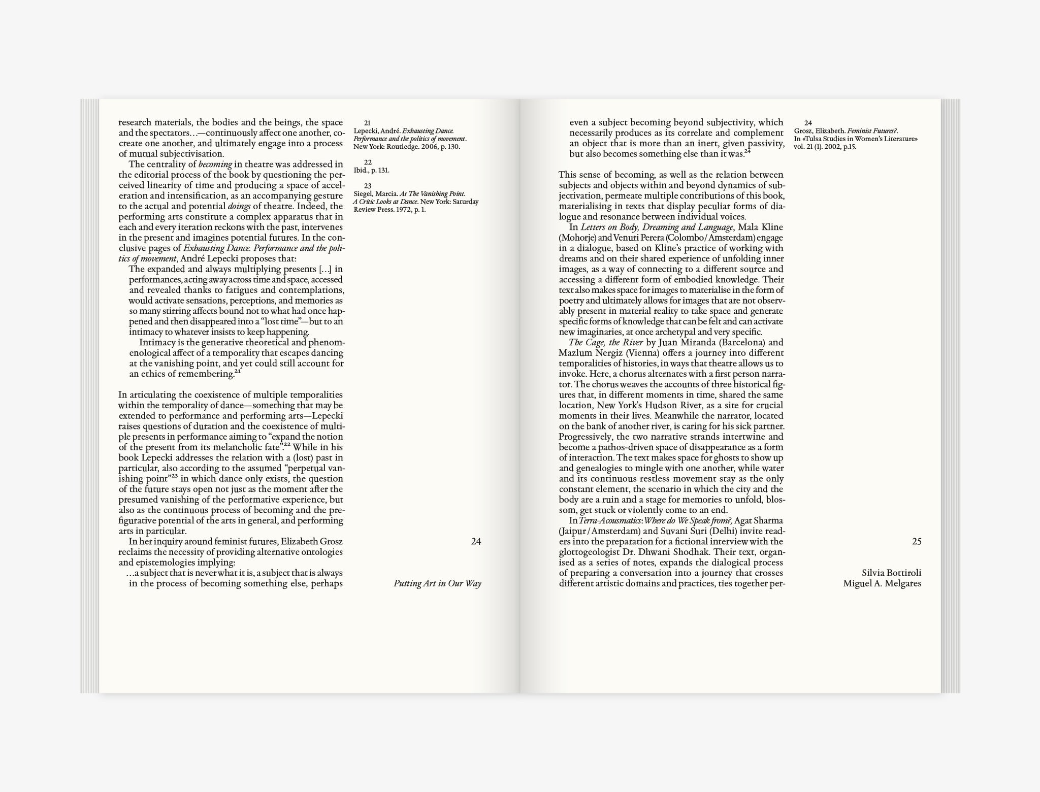 From fictional interviews to recipes, social-media exchanges to dramaturgical texts, theoretical essays to artistic interventions, the contributions gathered here are a diverse and multifaceted collection of dialogues. These interventions are singular and unique but share concerns and desires about the politicality of theatre as a realm where possible alternative realities can be enacted and potential future scenarios can be collectively rehearsed.